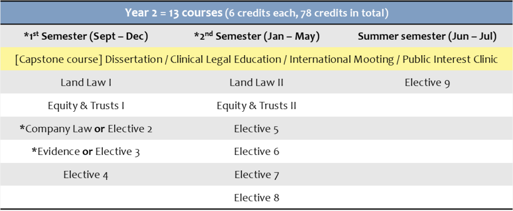 In the first year of studies, students will begin with a compulsory introductory course, Legal System & Legal Research, offered during the induction period in August. This course commences earlier than others to introduce the fundamentals of legal study and prepare students for substantive courses. Subsequently, students will take three full-year core courses: Contract Law, Tort Law, and Criminal Law. In addition, students will take one core course, Constitutional Law, in the first semester, followed by two core courses, Administrative Law, Commercial Law, and one elective course in the second semester.